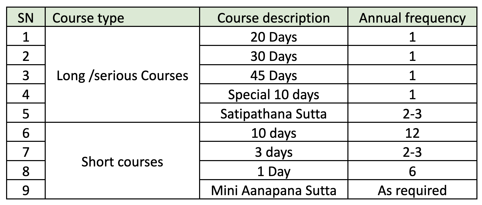 A 10-day course block, with capacity for approximately 200 students, where regular 10-day courses and shorter courses—such as one-day and three-day courses, children’s courses, and mini Anapana programs—will take place.