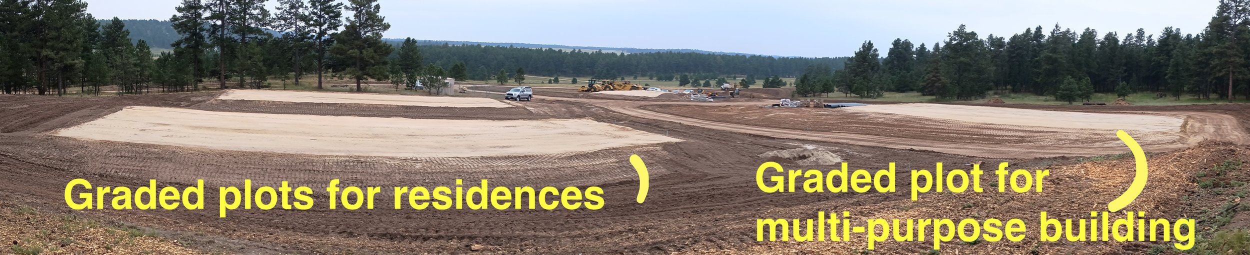 Panorama of Phase 1 site, showing pads for two residences, multi-purpose building, and parking lot.